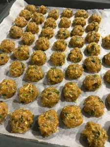 - Tapetez tava cu hârtie de copt și așez chiftelele cu puțină distanță între ele.