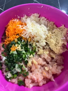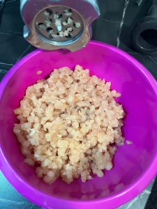 Pentru început, am tocat pieptul de pui folosind mașina de tocat. Poți folosi și carne gata tocată sau chiar carne de curcan, dacă preferi.