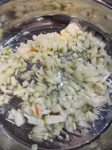 - Adaugă ceapa și las-o să se călească la foc mediu, aproximativ 5 minute, până devine translucidă. Presară puțină sare pentru gust.