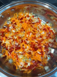 - Adaugă morcovul și ardeiul și mai lasă legumele să se înmoaie sub capac, amestecând periodic, aproximativ 10-15 minute.