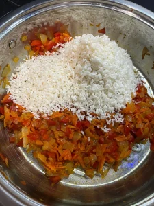 - Reduce focul și adaugă orezul. Amestecă 1-2 minute până ce orezul se încorporează bine cu legumele și se călește ușor.