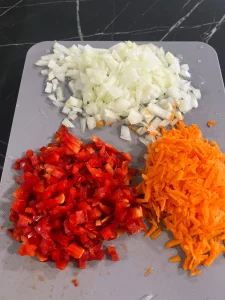 - Toacă ceapa și ardeiul roșu mărunt, iar morcovul dă-l pe răzătoarea mare.