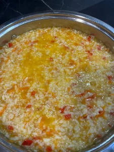- Gătește aproximativ 30 de minute (chiar dacă pe pachet scrie 13-15 minute), amestecând din când în când pentru a evita lipirea de fundul cratiței. Dacă orezul a absorbit toată apa și nu este complet fiert, mai adaugă o cană de apă fierbinte și mai lasă 3-5 minute pe foc.