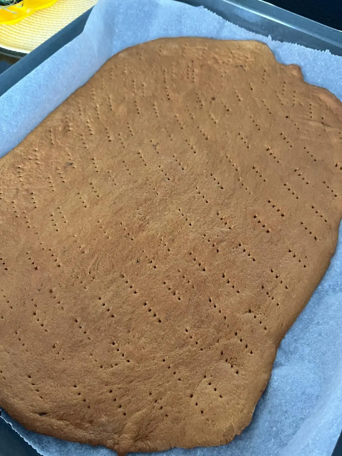 Pe o hârtie de copt, întind fiecare bucată de aluat într-o foaie subțire, de dimensiunea tăvii (aproximativ 25×35 cm) și îl înțep ușor cu o furculiță. Coc fiecare foaie pe dosul tăvii, în cuptorul preîncălzit la 180°C, timp de 8-10 minute, până devin ușor aurii. Atenție, foile sunt fragile când sunt calde, așa că le las să se răcească înainte de manipulare.