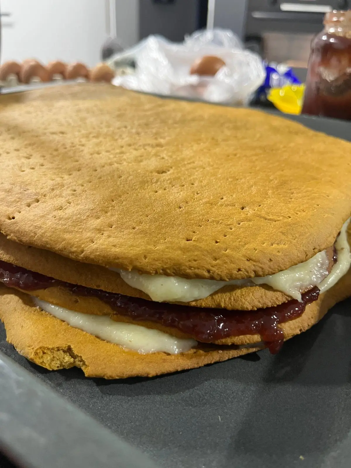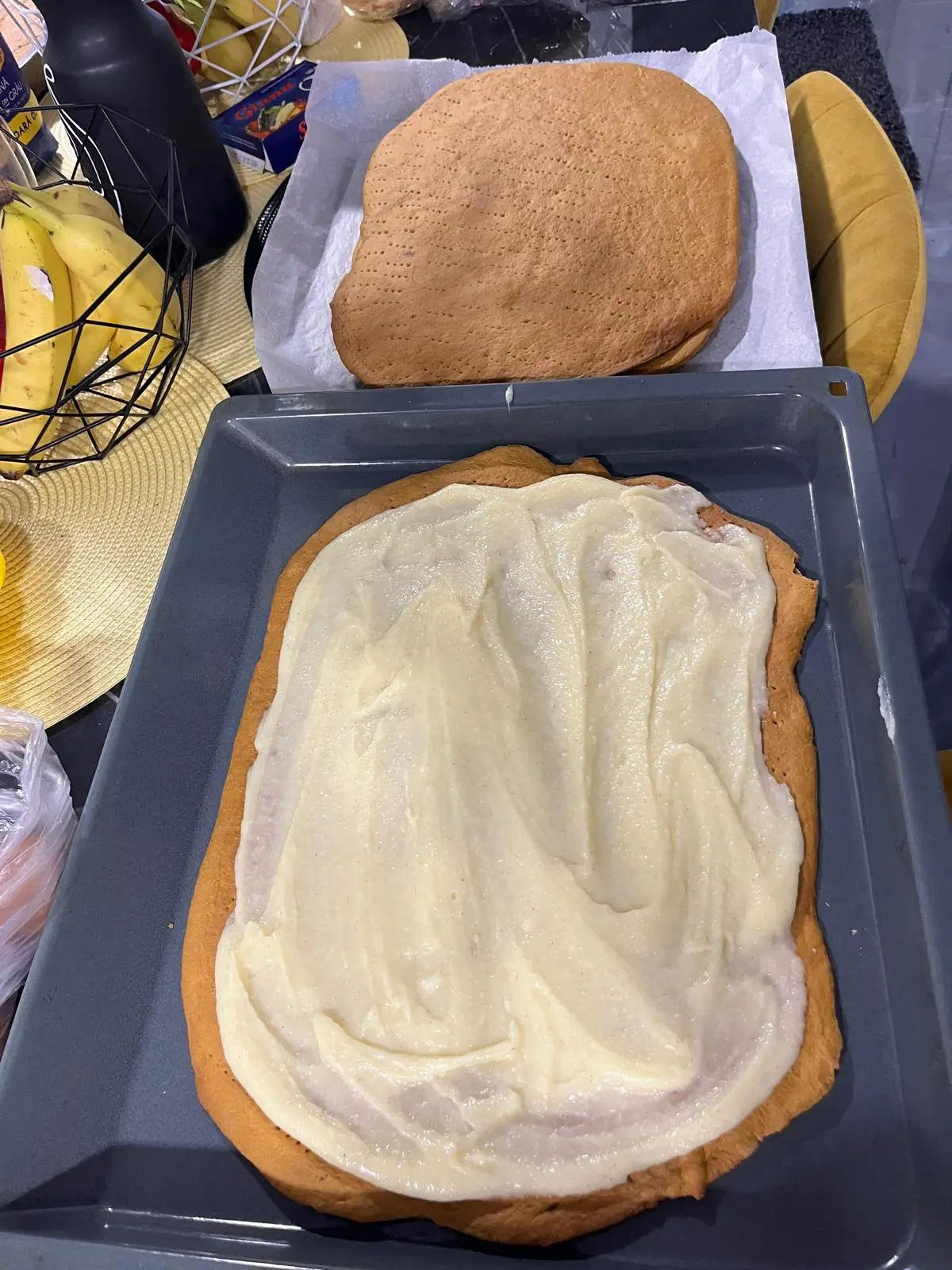 Acum vine partea mea preferată – asamblarea. Pe prima foaie, întind un strat generos de cremă. Adaug a doua foaie, peste care întind dulceața de cireșe – îmi place pentru că aduce un contrast dulce-acrișor (puteți folosi orice fel de gem).