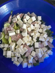 - Adaugă porumbul, apoi șunca și telemeaua tăiate cubulețe.